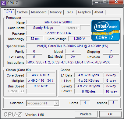 Для процессора Core i7-2600K частота после разгона составила 4,9 ГГц при напряжении питания ядер 1,2 В.