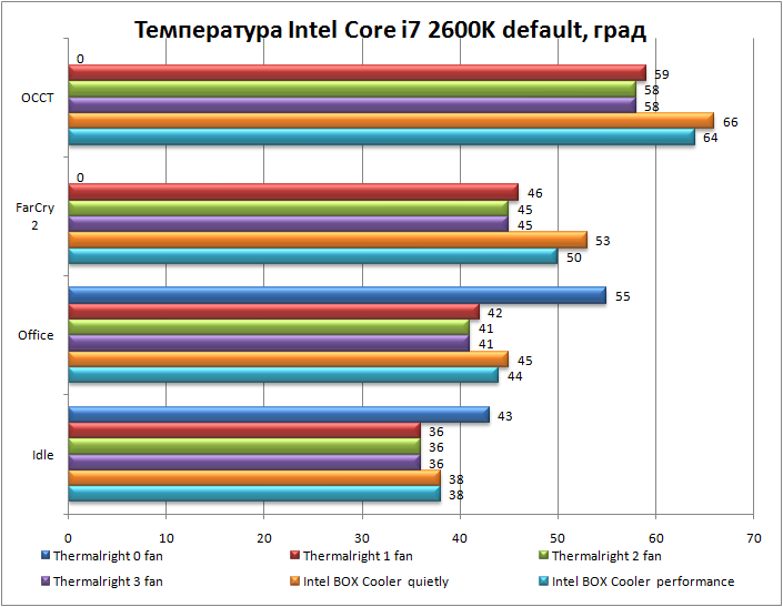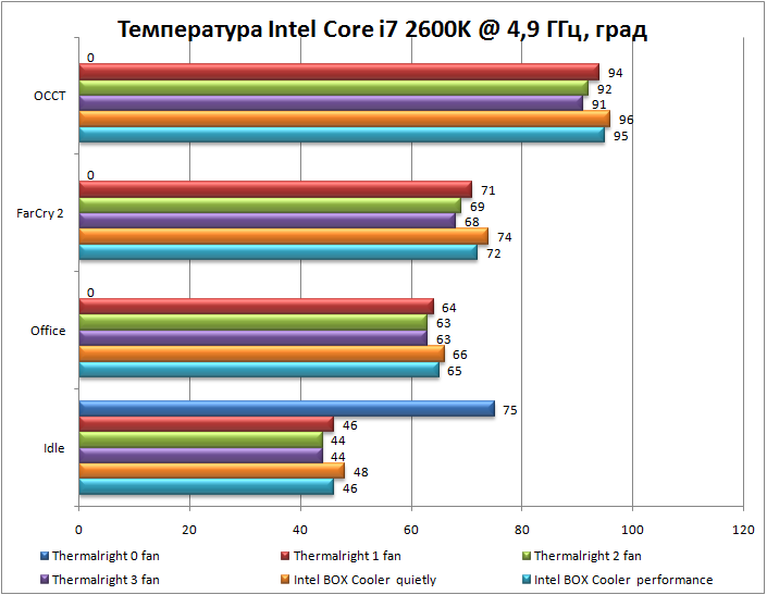На диаграмме можно увидеть, что в режиме бездействия процессор Core i7-2600K выделяет достаточно мало тепла, вследствие чего все тестируемые конфигурации систем охлаждения показывают примерно одинаковый результат. Даже в пассивном режиме температура процессора оставалась на довольно низком уровне, что свидетельствует о высокой эффективности рассеивания радиатора кулера ThermalRight Silver Arrow.