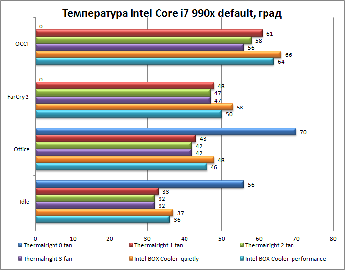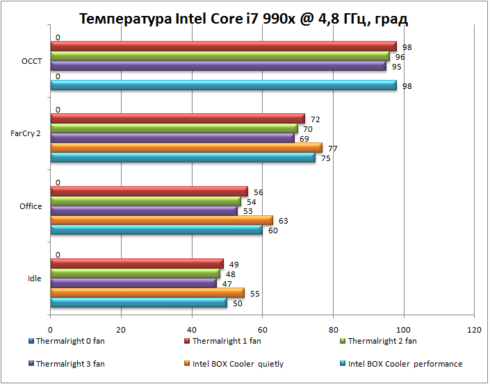 Также необходимо отметить, что боксовый кулер от Intel в режиме quietly не смог удержать разогнанный до 4,8 ГГц Core i7-990x при полной его загрузке утилитой OCCT в допустимых температурных пределах.