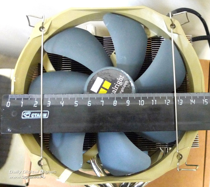 На первый взгляд кулер выглядит огромным, однако не громоздким. Этому способствует стреловидное «оперение» пластин, скрывающее массивность больших радиаторов.