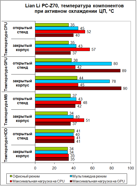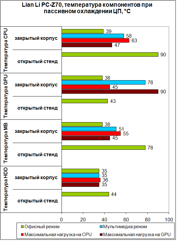 При пассивном охлаждении процессора эффективность работы штатной системы видна еще более явственно. Если открытый стенд с трудом справился с офисным режимом работы, то внутри PC-Z70 система чувствует себя вполне комфортно. Заявленная производителем максимально допустимая температура процессора превышена лишь при максимальных нагрузках, и то всего на один градус, а температурные показатели остальных компонентов системы остались примерно на том же уровне, что и в случае активного охлаждения.