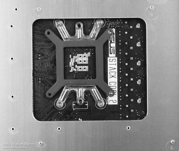 Благодаря немалым размерам выреза в поддоне материнской платы, систему охлаждения процессора можно заменить, не снимая «материнку» со своего места.