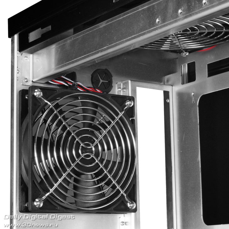 В передней части корпуса имеется три 120-мм вентилятора. Только установлены они не на передней панели, а на правой боковой стенке.