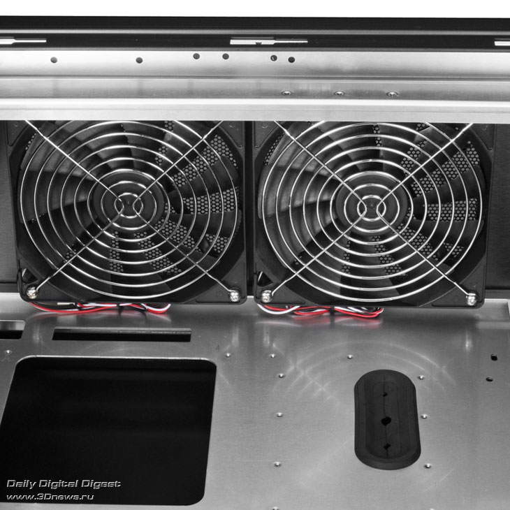 Сверху расположилось еще два вентилятора, но только размером побольше — диаметр каждого из них равен 140 мм.