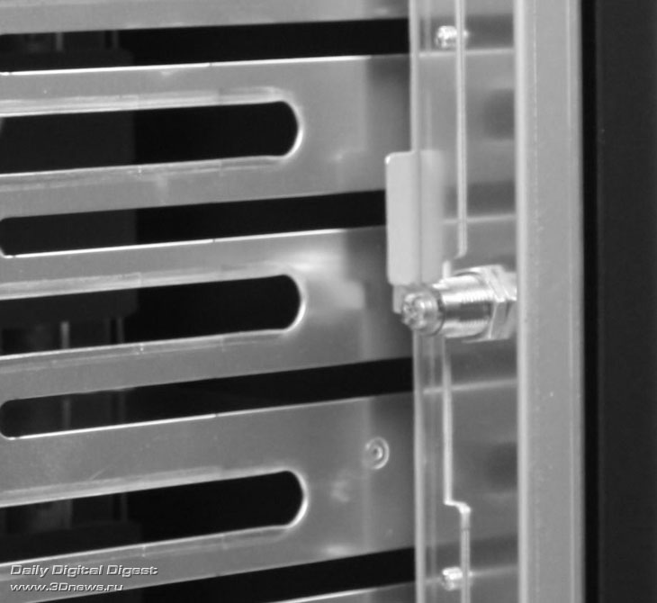 Реализован он довольно хитрым образом — пазы, предназначенные для салазок жестких дисков, закрыты металлической пластиной. Для того чтобы установить жесткий диск в стойку или изъять из нее, необходимо открутить винтик, поджимающий планку. Таким образом, без снятия боковой стенки извлечь жесткий диск невозможно.