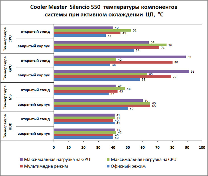 Проверим, насколько эффективно штатная система охлаждения Silencio 550 справится с нашим тестовым стендом.