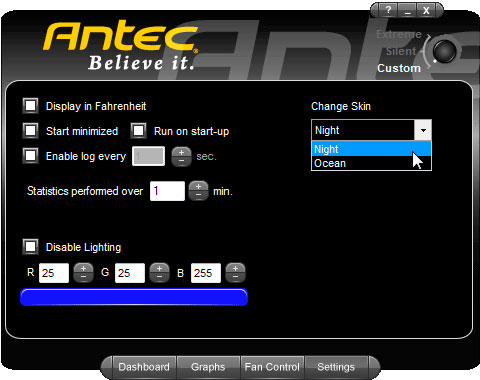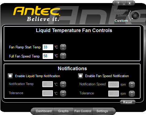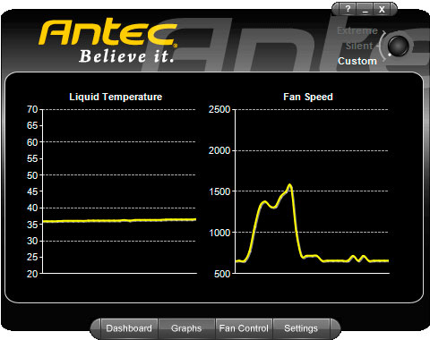 Показания уровня шума, скорее всего, изменяются математически пропорционально скорости вращения вентиляторов, так как никакого встроенного шумомера в Antec KÜHLER H2O 920, конечно, нет. А вот показания температуры охлаждающей жидкости очень похожи на правду, тем более что установить в цепи системы маленький температурный датчик не составляет никакого труда. На этой же вкладке можно выбрать режимы работы системы: Extreme, Silent и Custom.