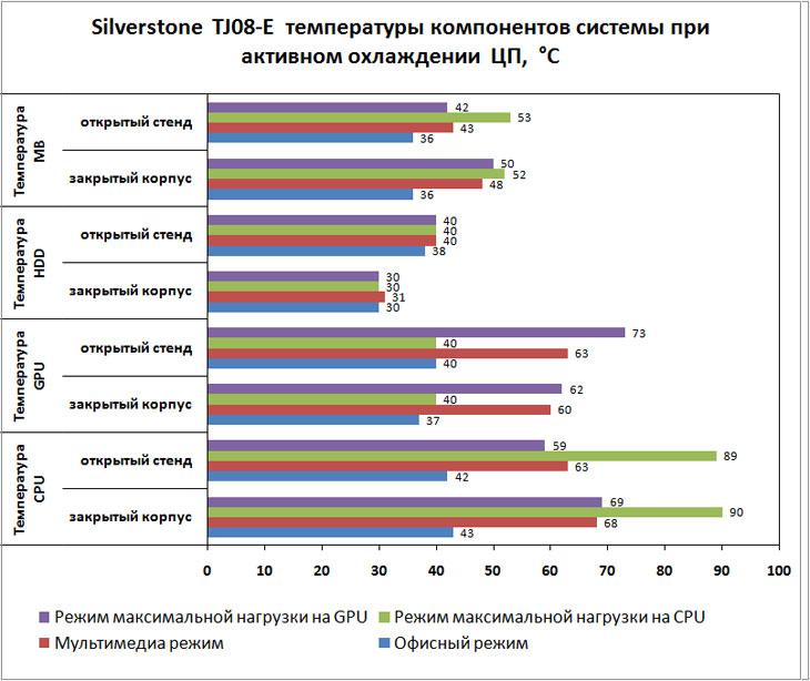 В режиме активного охлаждения корпус хотя слегка и проигрывает открытому стенду по ряду показателей, но эта разница крайне мала. Наиболее заметная разница в температурных показателях жесткого диска, однако она говорит в пользу корпуса: 30 градусов против 40. В целом все компоненты системы чувствуют себя комфортно даже при высокой нагрузке. Теперь усложним задачу и отключим вентилятор на радиаторе процессора.