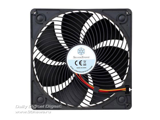 В комплекте с корпусом поставляется один 180-мм вентилятор, который установлен, как мы уже знаем, на передней панели и работает на вдув. Благодаря большим размерам крыльчатки нет необходимости в высокой скорости вращения для создания эффективного воздушного потока, поэтому максимальная скорость вращения вентилятора всего 1200 оборотов в минуту при создаваемом потоке воздуха в 130 CFM. Опционально на заднюю панель можно установить 120-мм вентилятор.