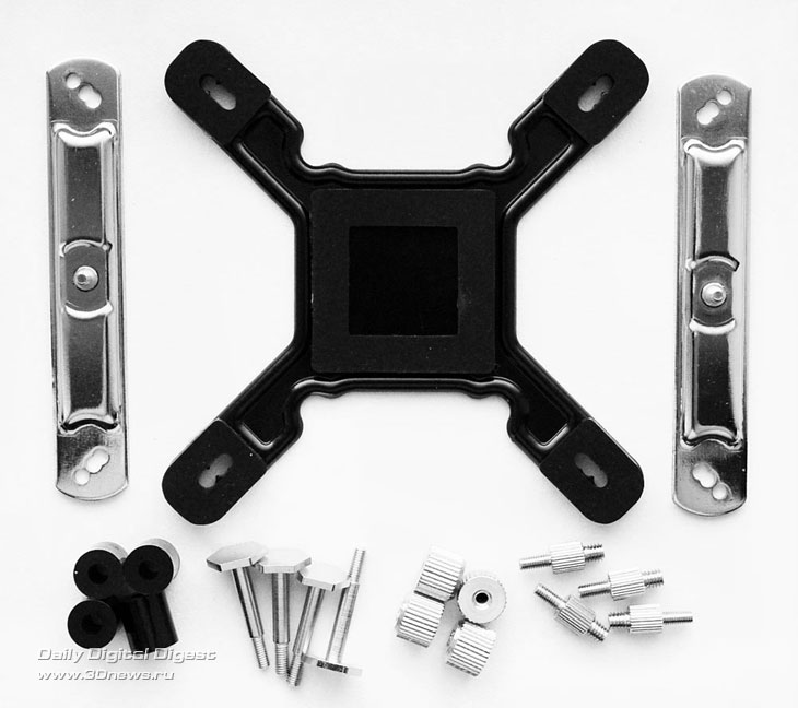 В комплект для платформ с процессорами Intel входит усилительная пластина с изоляционной прокладкой, две стальные направляющие, чёрные пластиковые втулки, шпильки, гайки и дополнительные двусторонние шпильки для LGA2011: