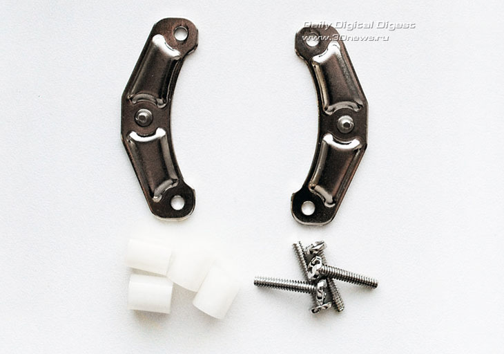 В комплекте креплений для процессоров AMD находятся стальные направляющие пластины, белые пластиковые втулки и четыре винта: