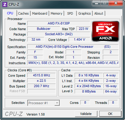 Восьмиядерный процессор со штатным нешлифованным теплораспределителем при фиксированном в значении 22,5 множителе был разогнан до 4,5 ГГц с повышением напряжения в BIOS материнской платы до 1,3625 В: