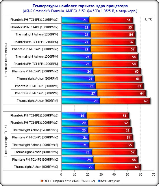 Thermalright Archon тестировался как в режиме с одним штатным вентилятором Thermalright TY-140, так и с двумя такими же вентиляторами. С ними же дополнительно был проверен и Phanteks PH-TC14PЕ.