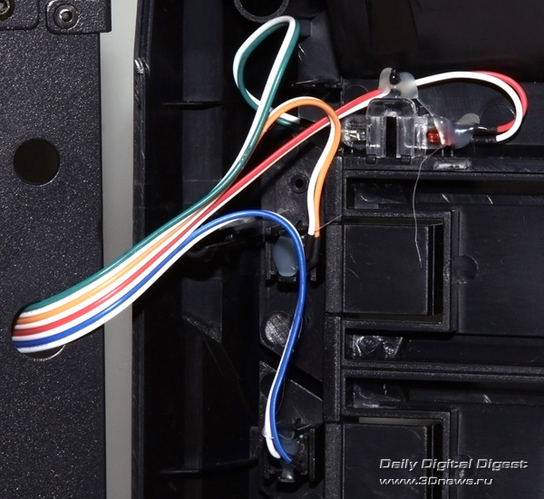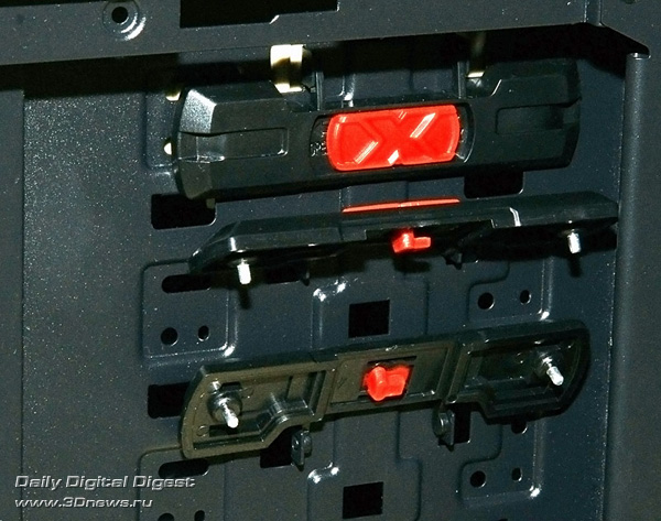 Внешние 5,25-дюймовые устройства/приводы фиксируются на шасси безвинтовыми зажимами с левой стороны. Впрочем, дополнительно закрепить их винтами с правой стороны в некоторых случаях будет полезно. Переходника и фальшпанели для крепления в 5,25-дюймовом отсеке внешнего 3,5-дюймового устройства (устройства для чтения карт памяти, например) здесь, к сожалению, не предусмотрено. Более того, длина 5,25-дюймового устройства, установленного во второй сверху отсек, не должна превышать 20 см, иначе оно упрётся в одну из плат с разъёмами для вентиляторов (см. фото).