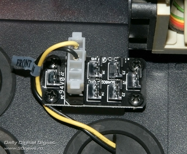 Причем 18 корпусных пропеллеров можно подключить (через стандартные 3-проводные разъёмы) к трём (по 6 на каждый) плавным регуляторам оборотов, ручки которых выведены на верхнюю панель (Side/Top/Front, см. выше). Для этого в корпусе смонтированы три мини-платы разъёмов, см. фото.