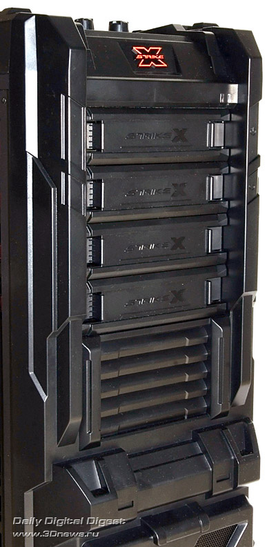 К сожалению, на панели разъёмов не нашлось портов FireWire и eSATA. А встроенные кабели USB 3.0 возможны двух вариантов — для внутреннего разъёма на «материнке» или для внешнего (Тип А). Пластик верхней панели тот же, что и у передней, изысками не радует. Зато индикатор включения ПК выполнен в виде двух длинных светящихся полосок по бокам панели разъёмов, что разнообразит впечатления от использования Strike-X ST.