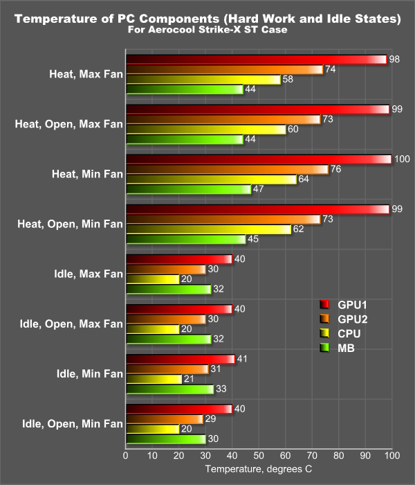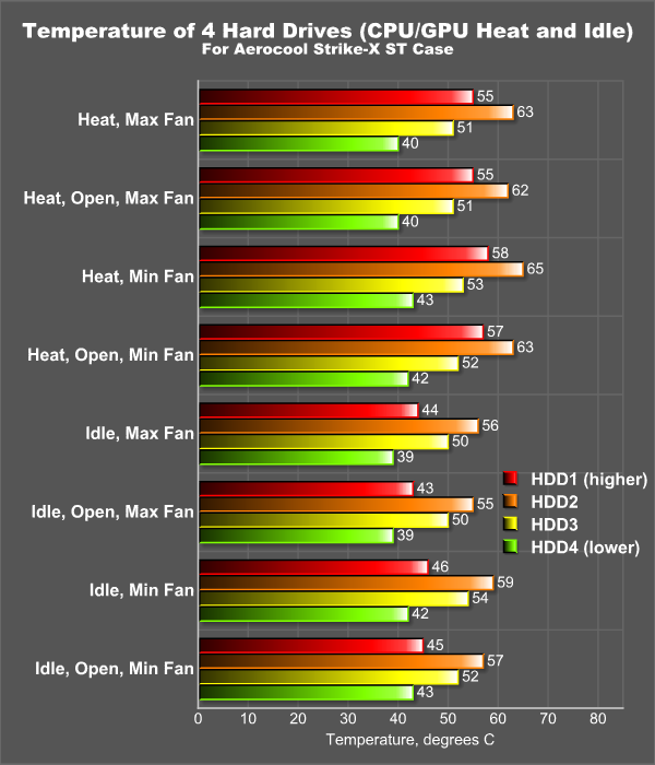 Одновременно прогревались и все 4 HDD с контролем их температуры по встроенным термодатчикам. На каждом из дисков был запущен тест случайного чтения блоками по 64 Кбайт. Работающие жёсткие диски были установлены в 1-ю, 4-ю, 7-ю и 10-ю корзинки, а остальные места были заняты неподключенными 3,5-дюймовыми накопителями (для затруднения воздухотока, что имитирует случай установки 10 накопителей). Подчеркнем, что в данной конструкции корпуса и при наличии сквозного потока воздуха диски друг от друга нагреваются мало, поэтому включать в работу все 10 дисков особого смысла не было (да и физически подключить их нам было уже некуда — возможные слоты для установки многоканального SATA-контроллера были перекрыты видеокартами). Все измерения проводились нами при работающем «прогреве» жестких дисков (проводить измерения при «ждущих» винчестерах мы в данном случае посчитали неинформативным). Остальные детали испытаний аналогичны описанным в обзоре корпуса CM Storm Trooper.