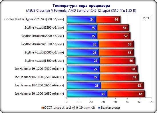 Наименее эффективными оказались два кулера Ice Hammer. Они проигрывают ближайшему конкуренту из Scythe два градуса Цельсия без учёта разницы в скорости вращения вентиляторов и уровня шума. А на примерно одинаковых скоростях (1650 и 1500 об/мин) Scythe оказывается эффективнее сразу на 6-7 градусов Цельсия, что может быть критично для корпусов стандарта HTPC. Вместе с этим нельзя не отметить, что даже такие маленькие и дешёвые кулеры справились с разгоном двухъядерного процессора AMD Sempron до 3,6 ГГц. Разница в эффективности между Ice Hammer IH-1000 HTPC и IH-1200 HTPC составила всего 1 градус Цельсия в каждом скоростном режиме.