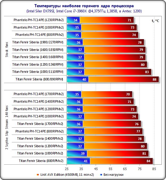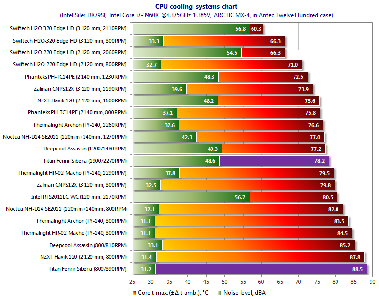 Давайте внесём Fenrir Siberia Edition в сводную таблицу* и на диаграмму, построенную при разгоне процессора до 4,375 МГц и напряжении 1,385 В для всех кулеров в их штатных комплектациях. Как и большинство других систем охлаждения, новинка Titan включена в рейтинг в тихом режиме работы (800/890 об/мин) и на максимальных оборотах вентиляторов (1900/2270 об/мин):