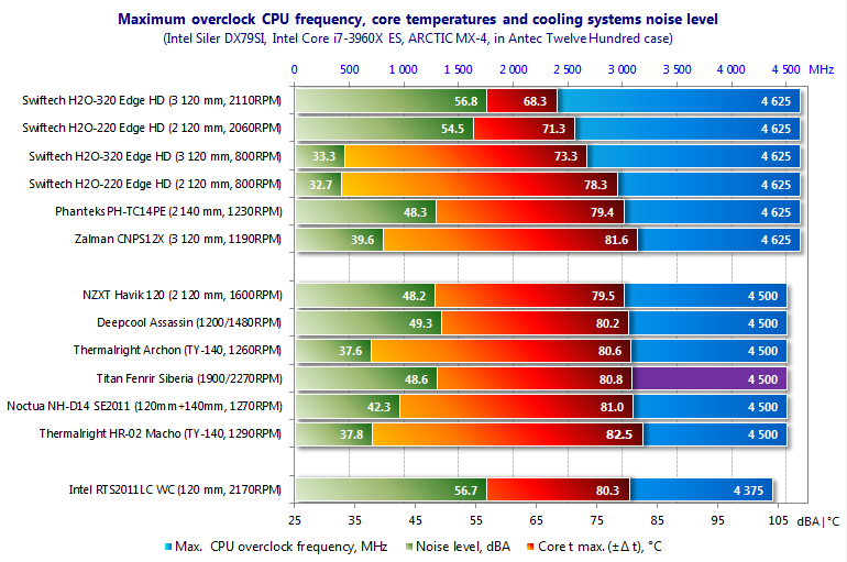 В таблице и на диаграмме с максимальными результатами разгона процессора под каждым из кулеров в их штатных комплектациях Titan Fenrir Siberia Edition также занимает среднее место, расположившись между Thermalright Archon с одним вентилятором TY-140 при 1260 об/мин и Noctua NH-D14 SE2011 с его двумя вентиляторами: