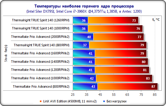 По максимальному разгону процессора новинка разместилась в средней группе, сразу вслед за своим старшим братом — кулером Thermaltake Frío Extreme, проиграв ему по уровню шума.