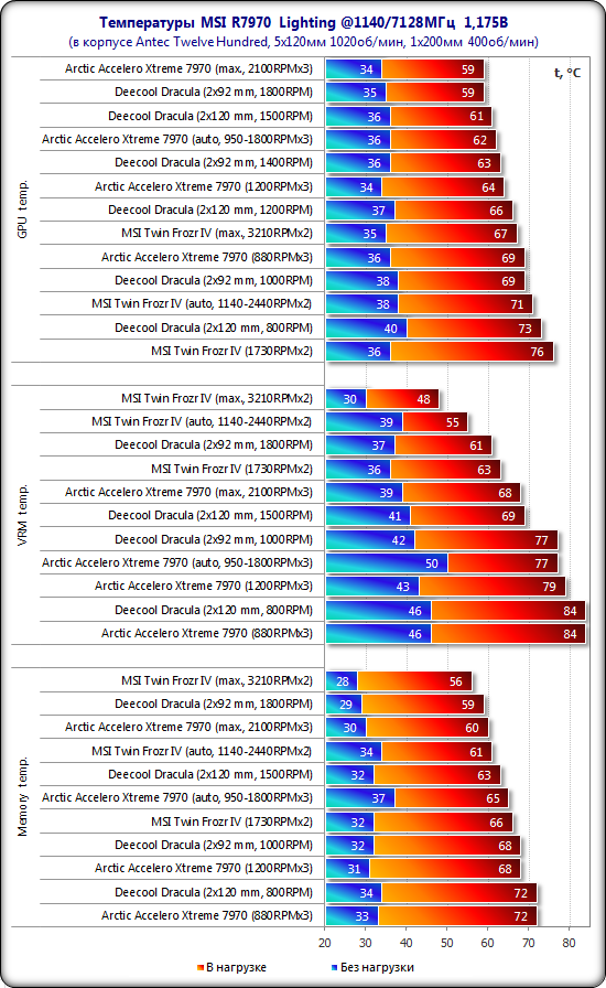 Видеокарта MSI была разогнана до частот 1140/7160 МГц: ![]() Программы, применявшиеся при тестировании, устанавливались под операционной системой Microsoft Windows 7 Ultimate x64 SP1. Использовались библиотеки DirectX End-User Runtimes (ноябрь 2010-го), а также драйверы видеокарты AMD Catalyst 12.4. Прогрев видеокарты был выполнен пятью циклами теста игры Aliens vs Predator в разрешении 2560х1440 с максимальными настройками качества графики, анизотропной фильтрацией уровня 16х и сглаживанием степени 4х: ![]() Данный тест при заданных нами настройках качества даже мощные видеокарты нагружает весьма сильно и при этом не может привести к выходу её из строя, о чем нас честно предупреждает FurMark, от полноценного использования которого мы в данной статье отказались. Для мониторинга частот и температур видеокарт использовалась утилита MSI Afterburner версии 2.2.1, а также программа GPU-Z версии 0.6.2: Тестирование в каждом скоростном режиме работы вентиляторов проводилось не менее двух раз, а период стабилизации температуры между циклами тестирования составлял 10-12 минут. Комнатная температура контролировалась установленным рядом с открытым системным блоком электронным термометром с точностью измерений 0,1 °C и возможностью мониторинга изменения температуры в помещении за последние 6 часов. Во время тестирования комнатная температура держалась у отметки 25,0 °С. Мы специально выдержали конфигурацию, программное обеспечение и методику тестирования идентичными тем, что использовались в статье об Arctic Accelero Xtreme 7970, чтобы сравнить эффективность Deepcool Dracula с наиболее производительной системой охлаждения для Radeon HD 7970. Кроме этого, в тестах присутствуют и результаты фирменной системы охлаждения видеокарты MSI Twin Frozr IV. Deepcool Dracula тестировался с двумя 92-мм вентиляторами Deepcool UF92 в скоростном диапазоне от 1000 до 1800 об/мин, а также с двумя вентиляторами Deepcool UF120 в скоростном диапазоне от 800 до 1500 об/мин. Скорость вращения вентиляторов всех систем охлаждения регулировалась с помощью специального контроллера путём изменения питающего напряжения. Перейдём к изучению результатов тестирования. ⇡#Результаты тестирования эффективностиРезультаты тестирования эффективности систем охлаждения представлены вашему вниманию на диаграмме: ![]() Очевидно, что эффективность Deepcool Dracula находится на самом высоком уровне. Причём вариант с двумя 92-мм вентиляторами, имеющими более сфокусированный воздушный поток, ничуть не менее выгоден с точки зрения эффективности, чем вариант с двумя большими 120-мм вентиляторами. По температуре графического процессора Dracula не уступает Arctic Accelero Xtreme 7970 и превосходит эффективность MSI Twin Frozr IV, а по температуре силовых элементов и микросхем памяти хоть и проигрывает последней, но зато оказывается эффективнее Arctic. Впрочем, разница совсем невелика, главное — Dracula в любом из двух протестированных сегодня вариантов компоновки с вентиляторами способен справиться с охлаждением неплохо разогнанной Radeon HD 7970 даже при минимальных скоростях работы вентиляторов (1000 об/мин для 92-мм, и 800 об/мин для 120-мм). Что касается уровня шума, то так как вентиляторы в комплект Dracula не входят, то проводить его сравнение с Arctic или MSI не совсем корректно, ведь пользователь может самостоятельно выбрать любые подходящие для себя вентиляторы и установить их на радиатор с помощью универсального крепления. Использованные в нашем тестир