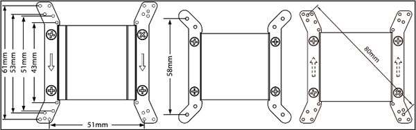 Процедура установки Deepcool Dracula на любую из поддерживаемых кулером видеокарт предельно проста. Для того, чтобы определить, какие из монтажных планок приворачивать к основанию кулера и в какие отверстия вворачивать шпильки крепления, можно воспользоваться следующим чертежом: