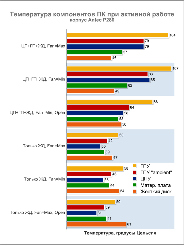 На диаграмме представлены результаты для одновременной нагрузки на все компоненты системы, а также при прогреве только жёстких дисков. Режимы по оси ординат соответствуют двум сочетаниям скоростей корпусных вентиляторов (Fan=Max и Fan=Min), двум режимам нагрузки на компоненты (все компоненты и только ЖД) и двум режимам со снятой левой боковиной корпуса (Open).