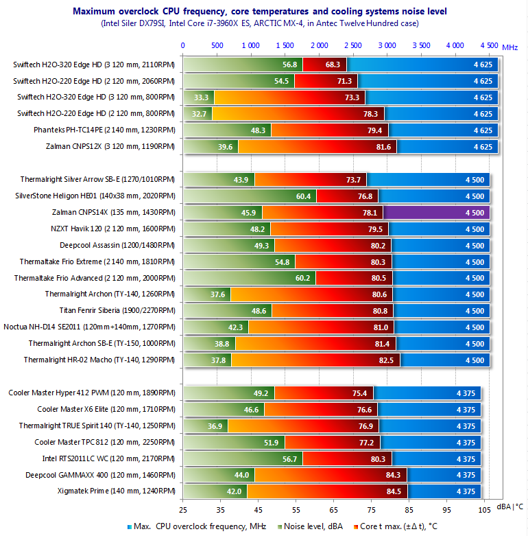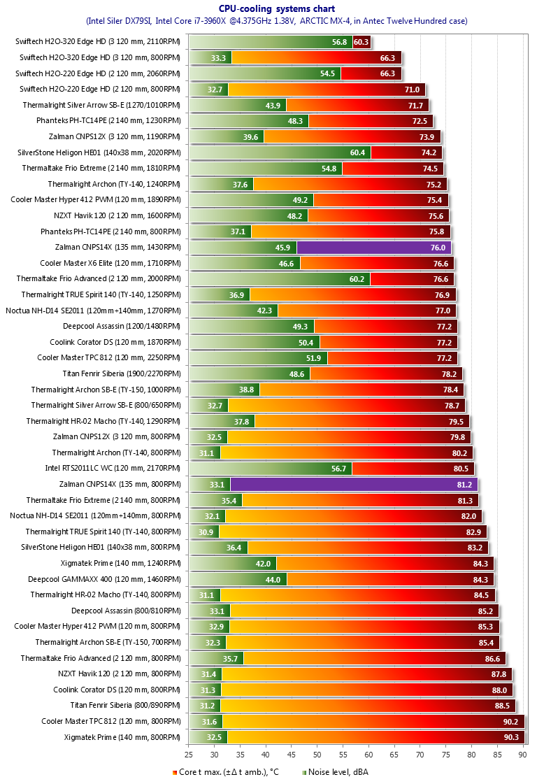 Неплохо выглядит новинка и на сводной диаграмме, обойдя при максимальной скорости вентилятора такие известные кулеры, как Thermalright TRUE Spirit 140 и Noctua NH-D14 SE2011, а при минимальных 800 об/мин успешно конкурирует с целой плеядой именитых брендов.