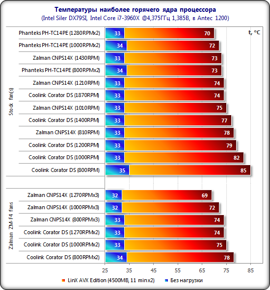 Не менее интересны результаты двух этих кулеров с альтернативными вентиляторами Zalman ZM-F4. Добавление на радиатор новинки пары 135-мм вентиляторов позволяет ей улучшить свою эффективность сразу на 4 градуса Цельсия и превзойти результаты, показанные Phanteks PH-TC14PE. Польза от установки дополнительных вентиляторов на Zalman CNPS14X есть и при меньших скоростях: при 1000 об/мин выигрыш в сравнении со штатной комплектацией составил 3 градуса Цельсия, а при 800 об/мин — 4 градуса Цельсия. Несмотря на тот факт, что дополнительные вентиляторы хорошо помогают и Coolink Corator DS, этот кулер не является конкурентом Zalman CNPS14X, уступая ему от 3 до 5 градусов Цельсия в пике нагрузки.