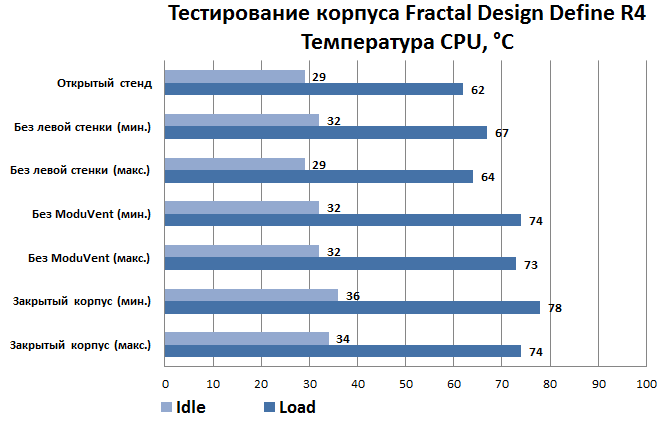 Как можно заметить, видеокарта оказывает существенное влияние на температуру процессора. На минимальных оборотах корпусные вентиляторы не успевают убирать горячий воздух из системного блока, заставляя процессор прогреваться до 78 градусов. Снятие пластиковой пластины шумоизоляции изменяет ситуацию с температурой ЦП незначительно, так как полноценному выбросу горячего воздуха от видеокарты через боковое отверстие мешает разместившийся вертикально TV-тюнер. То есть часть воздуха остается в пределах корпуса, направляясь вверх, к процессорному кулеру. Демонтаж левой стенки практически нивелирует разницу между размещением компонентов в корпусе Define R4 и на открытом стенде, но стоит ли брать шумоизолированный корпус и использовать его без одной из стенок? Думаем, нет.