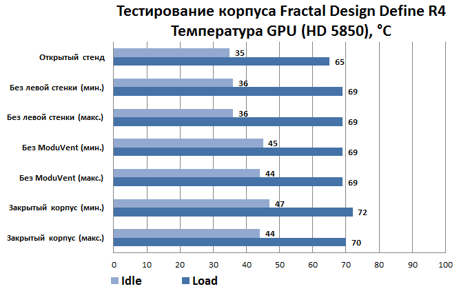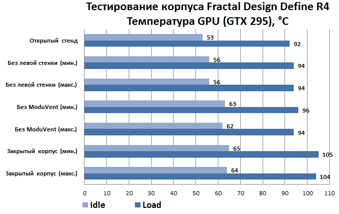 Максимальная нагрузка на компьютер вкупе с минимальной скоростью вращения корпусных вентиляторов заставила сработать термозащиту GTX 295 даже в бенчмаркинговом режиме FurMark. Повышение оборотов системных вентиляторов в корне ситуацию не изменило, оставив видеокарту на грани перегрева с температурой графического ядра 104 °C. Снятие пластины ModuVent открывает видеокарте второе дыхание, понижая рабочую температуру на целых десять градусов. Дальнейшее «раздевание» корпуса практически ничего не меняет, не считая, конечно, температуры центрального процессора. С другой стороны, рев турбины этой видеокарты в принципе несовместим с понятием «тихий компьютер». Соответственно, вероятность ее появления в подобном корпусе стремится к нулю. Именно это послужило причиной добавления в тестовую конфигурацию карты Radeon HD 5850 от (тогда еще) ATI.