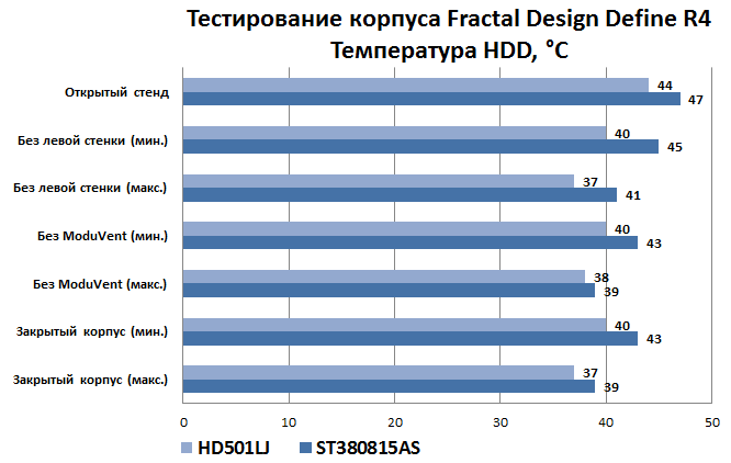 Хорошо обдуваемый Samsung лучше всего себя чувствовал в закрытом всеми панелями корпусе. Впрочем, повышение температуры на один градус при снятой пластине шумоизоляции вполне можно отнести к погрешности измерения, заключив тем самым, что обдув осуществляется довольно эффективно (не стоит также забывать о температуре окружающей среды, возросшей за время тестирования). Даже Seagate, которому от потока свежего воздуха практически ничего не доставалось, чувствовал себя в закрытом корпусе лучше, чем в открытом. На открытом стенде в условиях полного штиля оба диска проявили свой горячий нрав и здорово прогрелись, подтвердив тем самым необходимость в любом, даже самом мизерном, обдуве.