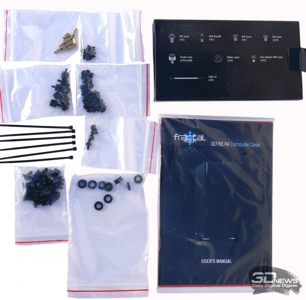Внутри корпуса, в одном из отсеков для 3,5-дюймовых устройств, расположилась коробочка, содержащая необходимые для крепежа винтики и несколько стяжек для проводов.