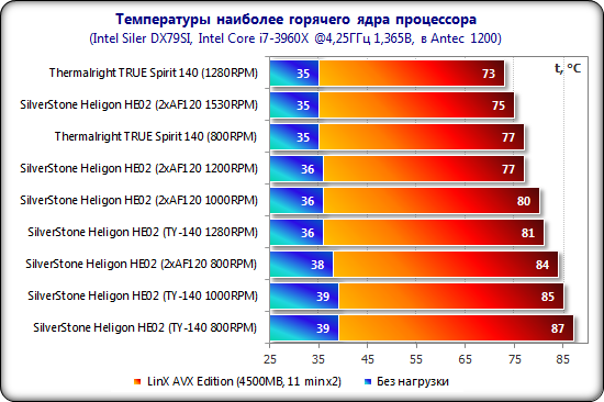 Полный снимок экрана во время проведения одного из циклов тестирования выглядит так: Нагрузка на процессор создавалась двумя последовательными циклами LinX AVX с указанными выше настройками. На стабилизацию температуры процессора между циклами отводилось 8–10 минут. За окончательный результат, который вы увидите на диаграмме, принята максимальная температура самого горячего из шести ядер центрального процессора в пике нагрузки и в режиме простоя. Кроме того, в отдельной таблице будут приведены температуры всех ядер процессора и их усреднённые значения. Комнатная температура контролировалась установленным рядом с системным блоком электронным термометром с точностью измерений 0,1 °C и возможностью почасового мониторинга изменения температуры в помещении за последние 6 часов. Во время данного тестирования она колебалась в диапазоне 23,4–23,8 °C. По эффективности SilverStone Heligon HE02 с установленными на него вентиляторами мы сравнили с кулером Thermalright TRUE Spirit 140 с одним штатным вентилятором TY-140 в двух режимах работы при максимальной скорости и в очень тихом режиме при 800 об/мин. С этим же вентилятором (TY-140) тестировался и SilverStone Heligon HE02. Кроме того, новинка была протестирована и с двумя 120-мм вентиляторами Corsair AF120 в диапазоне от 800 до 1600 об/мин. Добавим, что регулировка скорости вращения всех вентиляторов кулеров во время тестов эффективности осуществлялась с помощью специального контроллера путём изменения питающего напряжения с шагом 0,5 В: ![]() ⇡#Результаты тестирования эффективностиПроверку эффективности SilverStone Heligon HE02 в безвентиляторном режиме мы начали на неразогнанном процессоре. Оказалось, что 3,33 ГГц при 1,2 В шестиядерного Intel Core i7-3960X Extreme Edition — лёгкая задача для гиганта SilverStone, ведь даже после получасового тестирования в пике нагрузки максимальная температура процессора не превышала 68 градусов Цельсия. Гораздо интереснее проверить эффективность Heligon HE02 при разгоне CPU. Путём многочасового тестирования с постепенным повышением частоты процессора и его напряжения мы выяснили, что в безвентиляторном режиме кулер способен справится с охлаждением разогнанного до 4 ГГц при 1,265 В процессора — пиковая температура в этом случае составляет 87 градусов Цельсия: Результат превосходный! Даже если вспомнить о корпусных вентиляторах на скорости 600 об/мин, достоинства большого SilverStone Heligon HE02 в безвентиляторном режиме сложно не оценить. В этих же условиях Thermalright TRUE Spirit 140 со своим одним штатным вентилятором TY-140 при 600 об/мин охлаждает 4-ГГц процессор на 14 градусов Цельсия эффективнее в пике нагрузки: Однако если снять с TRUE Spirit 140 вентилятор, то температуры уже на 2–3 минуте теста зашкаливают, и включается режим защиты процессора (throttling). Наверное жаль, что при ещё более высоких частоте процессора и напряжении SilverStone Heligon HE02 не справился с его охлаждением: Впрочем, пожалуй, мы были слишком оптимистичны, пытаясь разогнать процессор до 4,25 ГГц при 1,36 В и используя пусть и большой, но только лишь радиатор без вентилятора(ов). Теперь восстанавливаем скорость корпусных вентиляторов до 1000 об/мин, оснащаем SilverStone Heligon HE02 сначала одним вентилятором TY-140, а затем и сразу двумя вентиляторами Corsair AF120 и проводим тесты в более привычных для большинства пользователей режимах: В сравнении по-прежнему участвует Thermalright TRUE Spirit 140. Вот что у нас получилось: ![]() Очевидно, что 