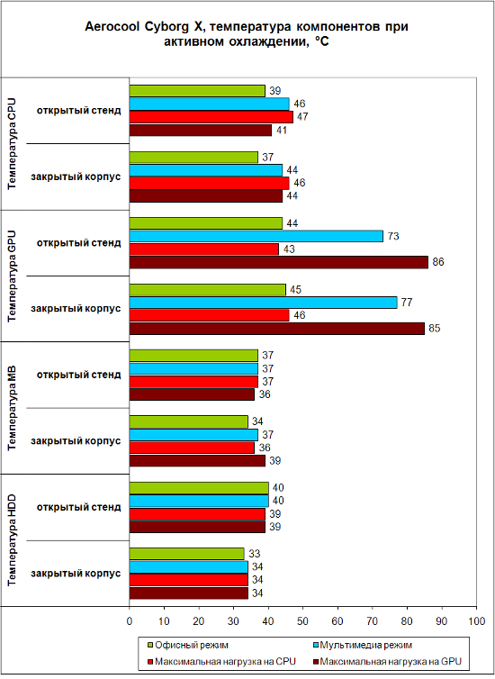 При активном охлаждении процессор чувствует себя более комфортно в корпусе, нежели на открытом стенде. Исключением является режим максимальной нагрузки на графический ускоритель, при котором CPU на «свежем воздухе» хотя и незначительно, но холоднее. Ситуация с видеокартой иная – в режим стресс-теста внутри Cyborg X максимальная температура на градус меньше, а в остальных режимах несколько превышает показатели, полученные на открытом стенде. Также внутри корпуса комфортнее материнской плате и жесткому диску.