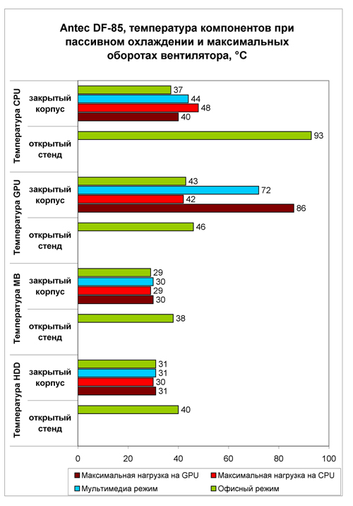 Мы отключили вентилятор на радиаторе процессора, но и в таком режиме DF-85 показывает очень хорошие результаты – температуры компонентов системы во всех режимах далеки от критических отметок. Более того, не были достигнуты и температуры, заявленные производителями как максимальные рабочие значения. Температура CPU не превысила даже отметки в 50 градусов ни в одном из режимов – такой результат в режиме пассивного охлаждения процессора мы получаем нечасто.