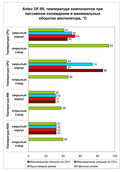 Снижение скоростей корпусных вентиляторов хотя и температуры некоторых компонентов к результатам открытого стенда, но позволило DF-85 сохранить преимущество по большинству показателей.