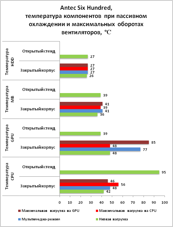 Мы решили протестировать корпус в четырех различных режимах и сравнить с результатами открытого стенда.