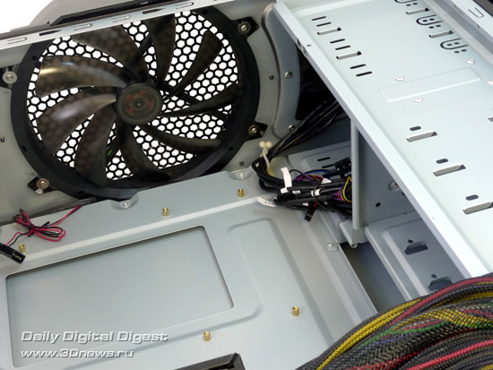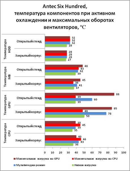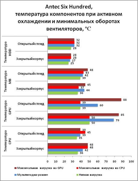 Снижение оборотов корпусных вентиляторов при активном охлаждении процессора практически не сказывается ни на одном компоненте системы. Разве что видеокарта при сильной нагрузке начинает ощутимо "подогревать" процессор. Поэтому если в данном корпусе планируется использовать именно активное охлаждение процессора, то лучше установить регулятор оборотов корпусных вентиляторов в минимальное положение - система станет существенно тише.