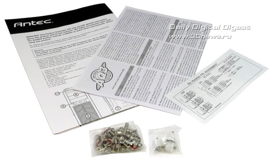 Комплект, мягко скажем, не богат, но все необходимое для сборки компьютера в корпусе в него входит. Правда, настолько предельная экономия на комплекте поставки корпуса среднего ценового диапазона немного разочаровывает.