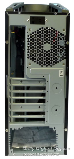 Заднюю панель можно назвать в общем-то обыкновенной, разве что блок питания расположен в нижней части корпуса, как это принято в геймерских корпусах. В верхней части расположен 120-мм вентилятор, выдувающий нагретый воздух за пределы корпуса.