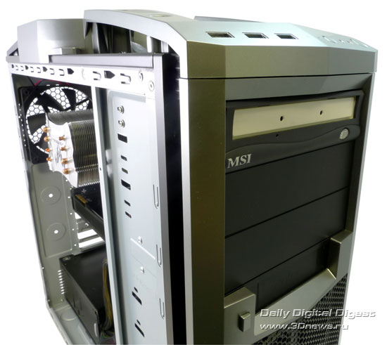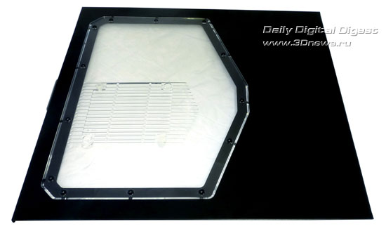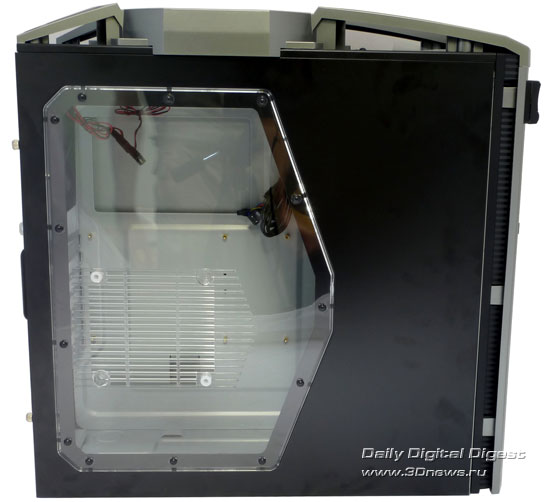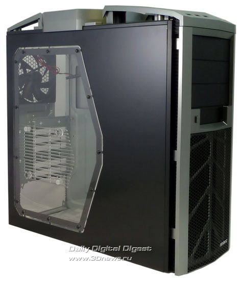 На окне вырезаны вентиляционные отверстия и есть крепление для одного 120-мм вентилятора. По расчетам производителя, дополнительный вентилятор должен оказаться напротив видеокарт, что улучшит их температурный режим. Тем, кто использует в своих компьютерах системы SLI или CrossFire из двух мощных видеокарт, такая опция придется по вкусу.