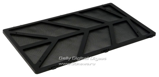 Переднюю панель достаточно легко снять, что позволит добраться до съемного фильтра, а также убедиться, что за ним находятся пластиковые решетки с крупными прямоугольными ячейками. Это не самое лучшее решение, поскольку такие решетки значительно снижают поток втягиваемого воздуха при установке фронтальных вентиляторов.