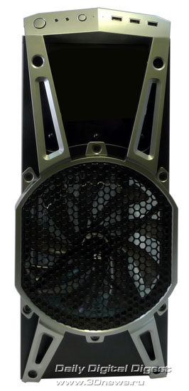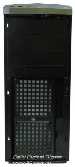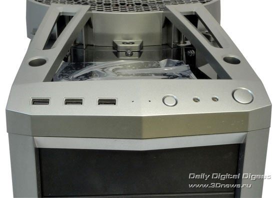 Наиболее интересной является верхняя панель. Первое, что бросается в глаза - огромный 230-мм вентилятор, расположенный ближе к задней части корпуса. Такой же вентилятор использовался в корпусе Antec Nine Hundred. Сверху вентилятор прикрыт решеткой с крупными ячейками, что не спасает корпус от попадания пыли, когда компьютер выключен. От рамки вентилятора расходятся декоративные "лапы", чем-то напоминающие дизайн Antec Skeleton, которые, при желании, можно использовать для переноски корпуса.