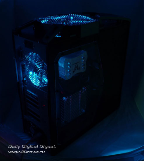 Оба вентилятора оснащены четырьмя светодиодами, которые светятся синим светом. И если подсветку верхнего вентилятора можно отключить рычажком, расположенным рядом с регуляторами оборотов, то подсветку заднего вентилятора отключить невозможно. Но, так как подсветка не слишком яркая, она особо не мешает, зато в темноте смотрится здорово.