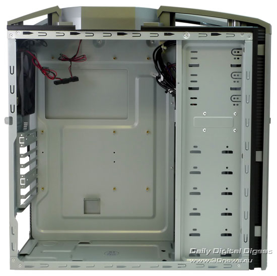 Снимаем боковую стенку Antec Six Hundred, прикрученную удобными винтами с большими головками, и изучаем корпус изнутри. Никаких особенностей здесь нет - пустое пространство для блока питания и материнской платы в задней части корпуса, а также вертикальная стойка для устройств форм-фактора 5,25 и 3,5-дюйма.