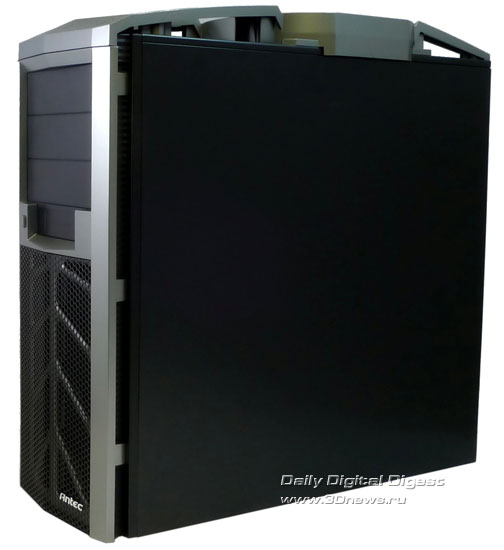 На передней панели корпуса находятся только три 5,25-дюймовые заглушки и одна 3,5-дюймовая, рядом с которой расположена некая кнопка, о предназначении которой мы расскажем в дальнейшем. Все остальное пространство занято решеткой с крупными шестиугольными ячейками, за которой прячется мелкоячеистый фильтр. За передней панелью по бокам также находятся вентиляционные отверстия - такой подход Antec использовала еще в корпусах линейки Performance One. Но те оснащались сплошной дверцей, и им нужны были хоть какие-то отверстия для втягивания воздуха, а здесь такой необходимости нет - вся нижняя часть передней панели представляет собой одно большое вентиляционное отверстие.