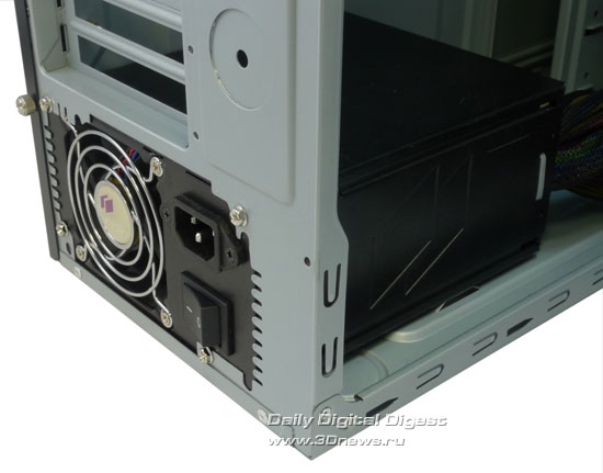 Первым делом, установим в корпус блок питания, иначе потом его установка будет затруднена из-за материнской платы. Блок питания со 120-мм или 140-мм вентилятором можно установить двумя различными способами: вентилятором вверх или вниз. Однако никаких вентиляционных прорезей в днище корпуса нет, поэтому располагать БП необходимо вентилятором вверх. Наш Hiper M730 оснащен 80-мм вентилятором на торце, поэтому его можно поставить и так, и так.