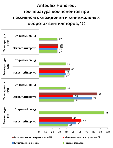 При максимальных оборотах вентиляторов корпус показывает отличные результаты. При низкой нагрузке ни один компонент не перегревается выше 50 градусов. Максимальная нагрузка на центральный процессор увеличивает его температуру всего на 14 градусов по сравнению с режимом низкой нагрузки. Тут важную роль играет расположение верхнего 230-мм вентилятора - он находится точно над кулером процессора и выполняет, в сущности, роль активного охлаждения, создавая мощный воздушный поток сквозь радиатор. Остальные компоненты практически не греются. Отдельно отметим, насколько хорошо себя чувствует жесткий диск: его температура не превышает 27 градусов, несмотря на отсутствие вентиляторов на передней панели. Видимо, это связано с тем, что верхняя часть корпуса хорошо продувается двумя вытяжными вентиляторами - воздушного потока оказывается достаточно для охлаждения жесткого диска. Открытый стенд, в котором процессор даже при низкой нагрузке прогревается до 95 градусов, и рядом не лежал.